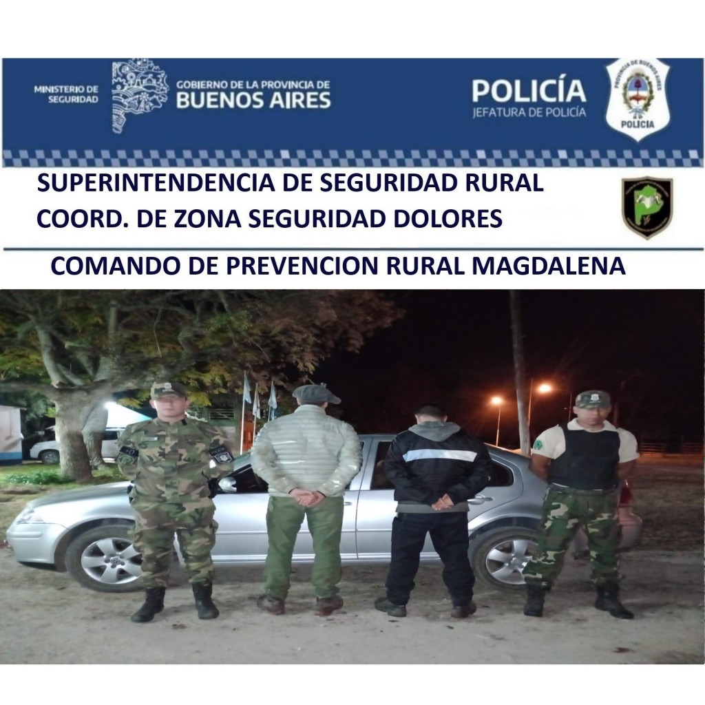 En la noche de ayer, la Patrulla Rural de Magdalena llevó a cabo un operativo de prevención de ilícitos en la zona de camino Malagamba, en el límite con el partido de La Plata. Durante la recorrida, los efectivos identificaron a dos individuos que se desplazaban en un automóvil VW Bora y que se encontraban cazando furtivamente.