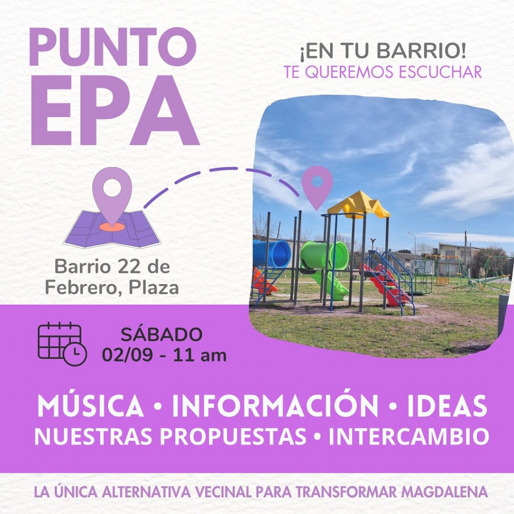 El evento inaugural, conocido como el "Punto EPA," tendrá lugar el sábado 2 de septiembre, con dos locaciones programadas para asegurar la máxima participación de la comunidad. Por la mañana, a las 11: 00hs., el punto de encuentro será la Plaza del Barrio 22 de Febrero, mientras que por la tarde, a las 16:00 hs , la cita se trasladará a la Plaza San Martín.