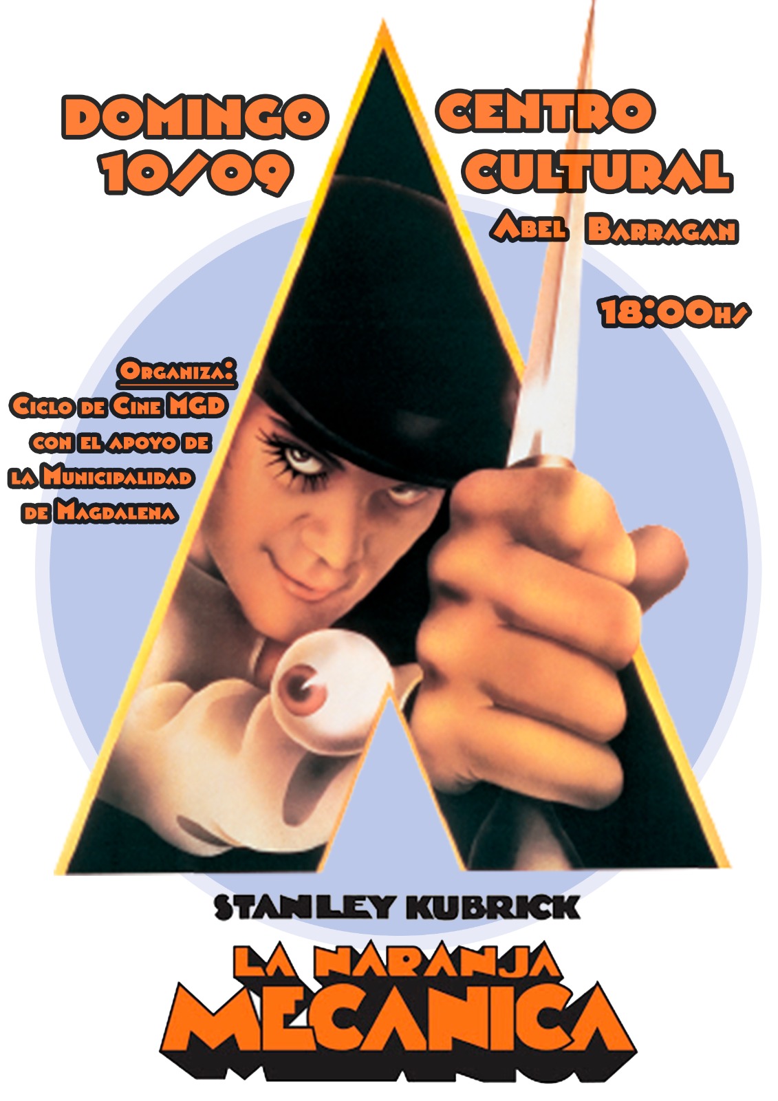 Hoy se presentará un clásico de la ciencia ficción: "La Naranja Mecánica" dirigida por Kubrick. Con entrada libre y gratuita,la función comenzará a las 18hs.