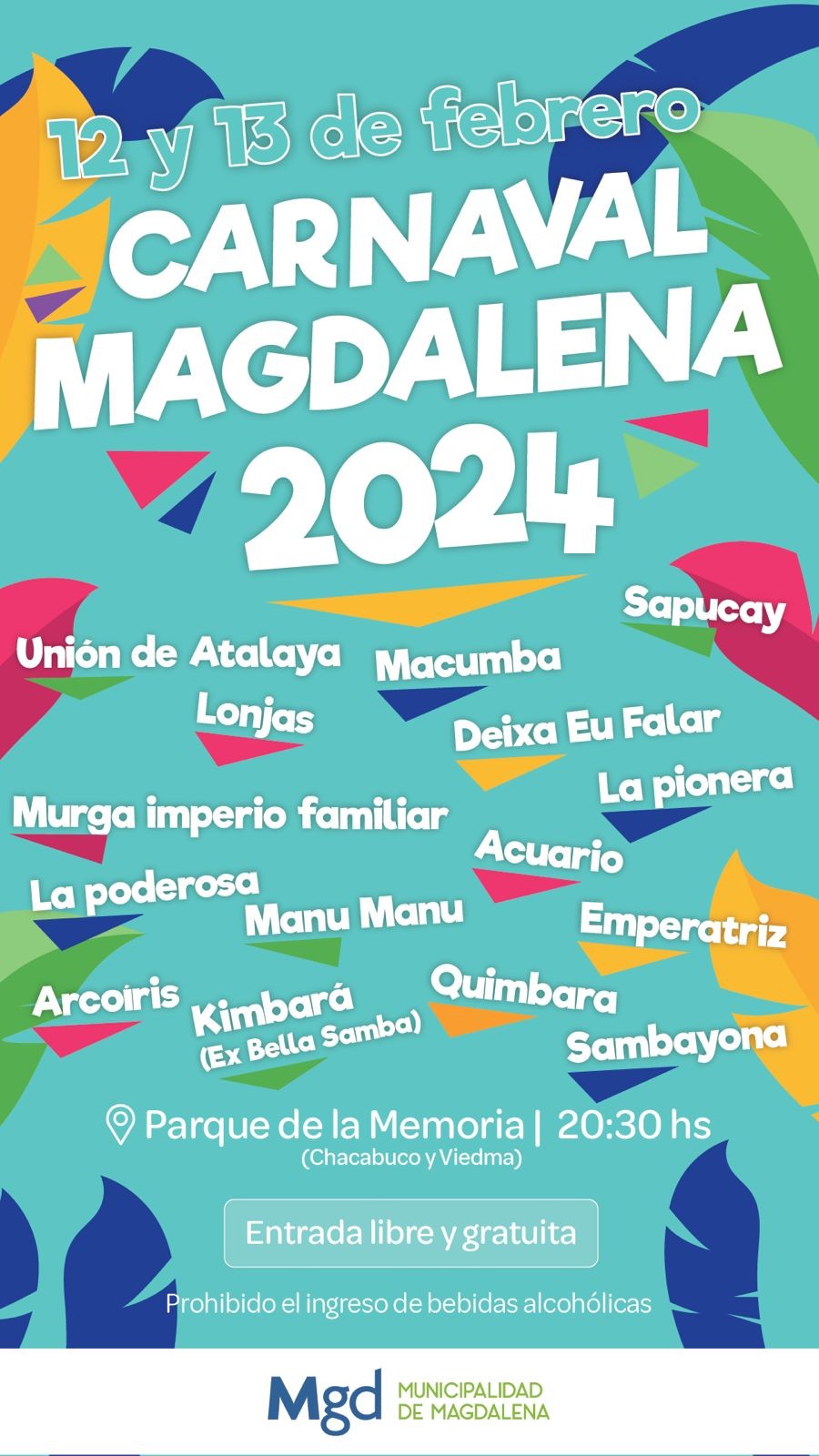 El proximo Lunes 12 y Martes 13 de Febrero, fin de semana largo en nuestro país, la Municipialdad de Magdalena organizará los Carnavales en el Parque de La Memoria. La misma será con entrada libre y gratuita a partir de las 20:30.