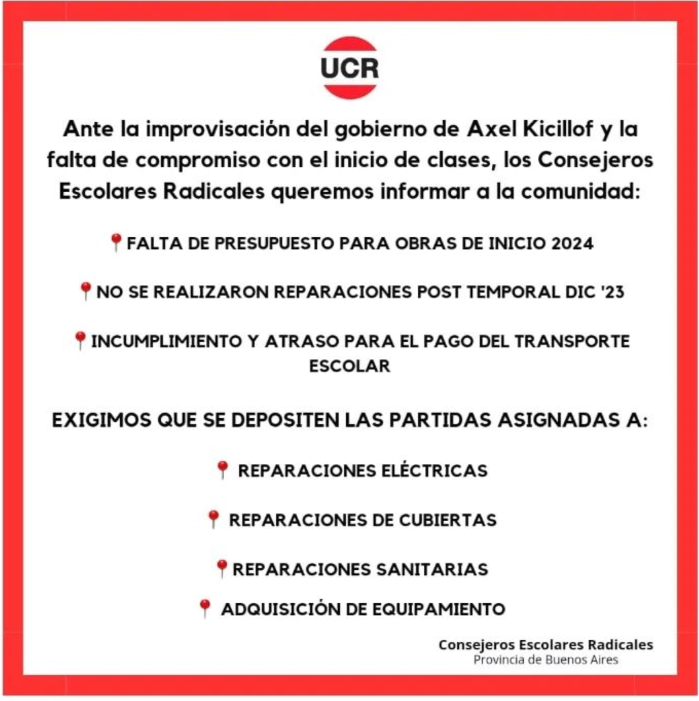 👉 "Ante la improvisación del gobierno de Axel Kicillof y la falta de compromiso con el inicio de clases, los Consejeros Escolares Radicales queremos informar a la comunidad que las escuelas de nuestro distrito se encuentran en un estado deplorable, producto de la desidia y la desinversión de la gestión provincial", dice el texto que lleva la firma de los consejeros boina blanca de la Provincia de Buenos Aires