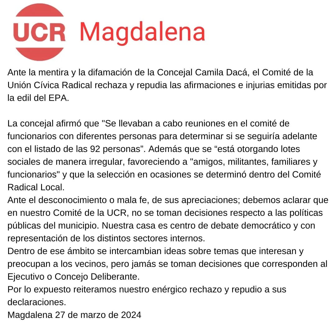 📝 En el comunicado, el Comité de la Unión Cívica Radical comenzó diciendo: "Ante la mentira y la difamación de la Concejal Camila Dacá, el Comité de la Unión Cívica Radical rechaza y repudia las afirmaciones e injurias emitidas por la edil del EPA".