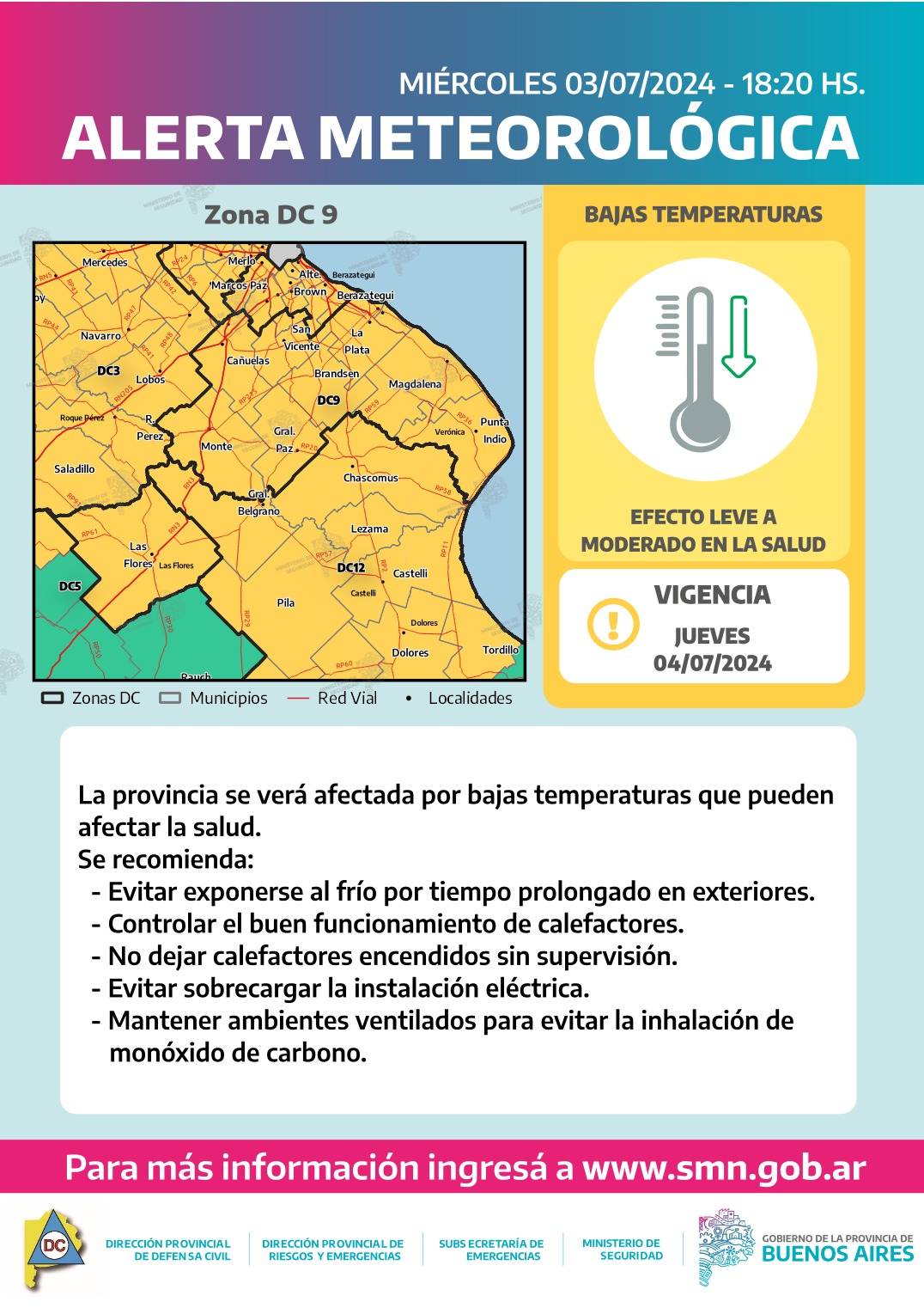 👉El Servicio Meteorológico Nacional (SMN) anunció una alerta amarilla por temperaturas extremas por frío para una treintena de localidades bonaerenses. Las temperaturas pueden ubicarse entre los 4 y 6 grados de mínima en las localidades bajo alerta.