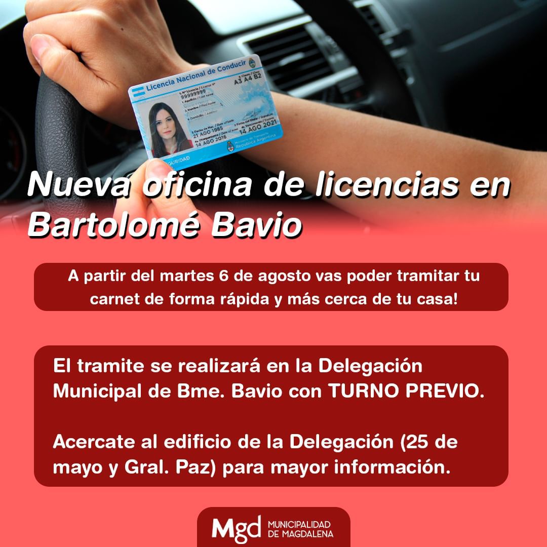 📢 A partir del martes 6 de agosto, comenzará a operar la nueva oficina de licencias de conducir en la Delegación Municipal de Bartolomé Bavio. Este nuevo servicio estará disponible todos los martes y promete hacer más accesible el proceso para los residentes de la zona.