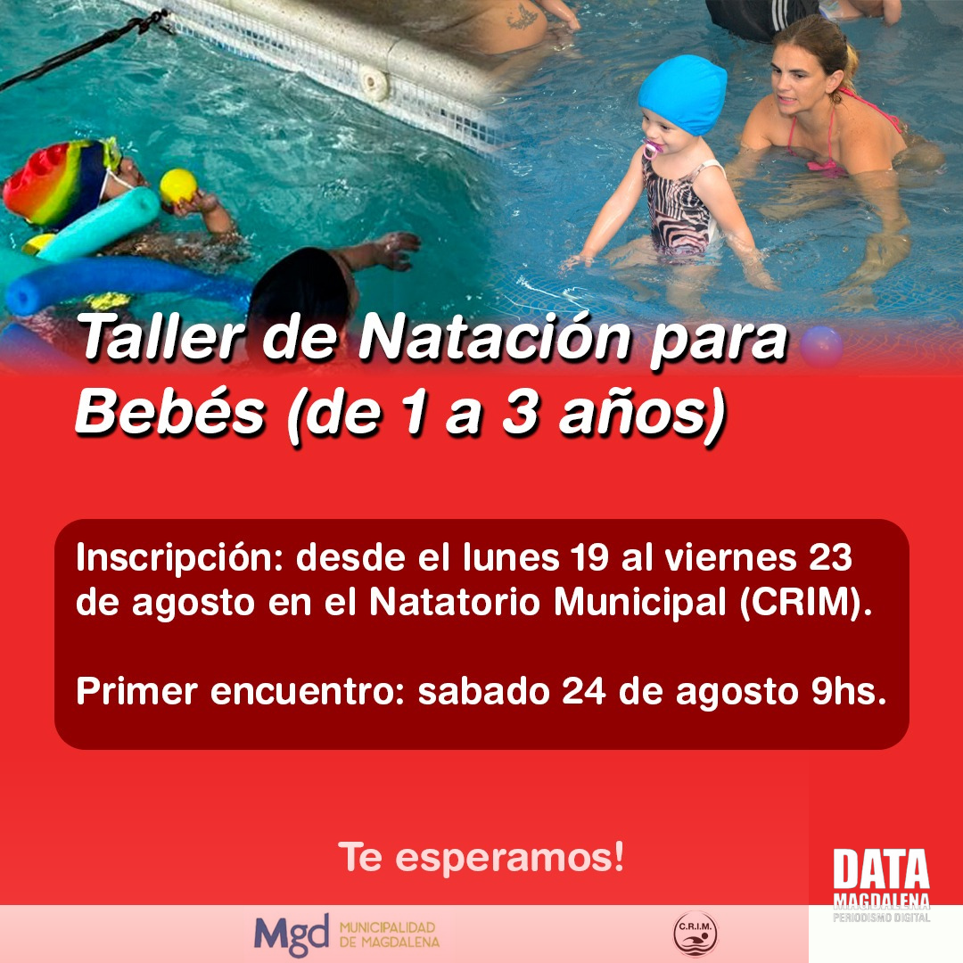 👉El área de Deportes de Magdalena abre las inscripciones para el Taller de Natación para bebés de 1 a 3 años. La convocatoria está disponible del 19 al 23 de agosto en el Natatorio Municipal del CRIM. El primer encuentro se llevará a cabo el sábado 24 de agosto a las 9:00 horas.
