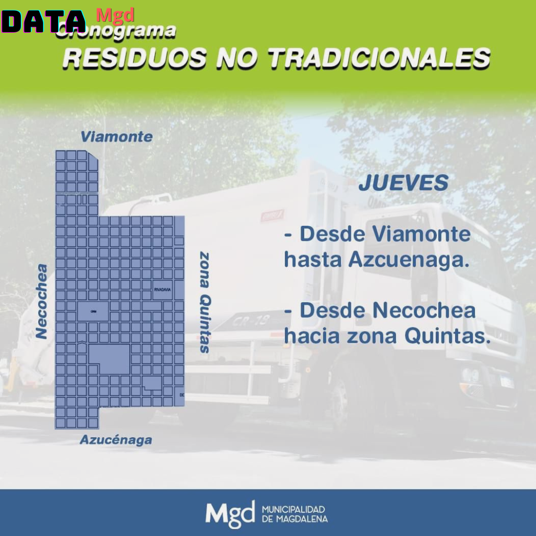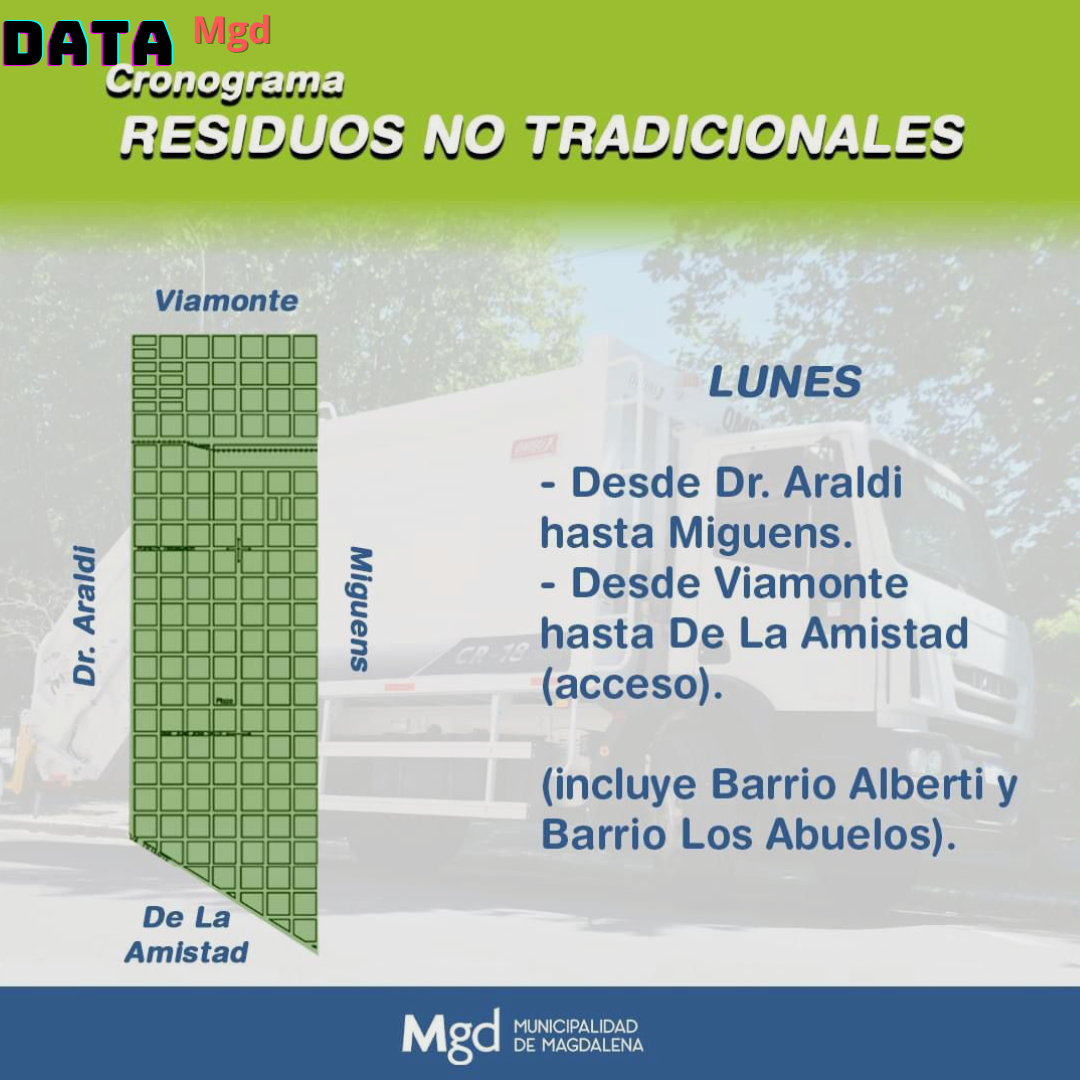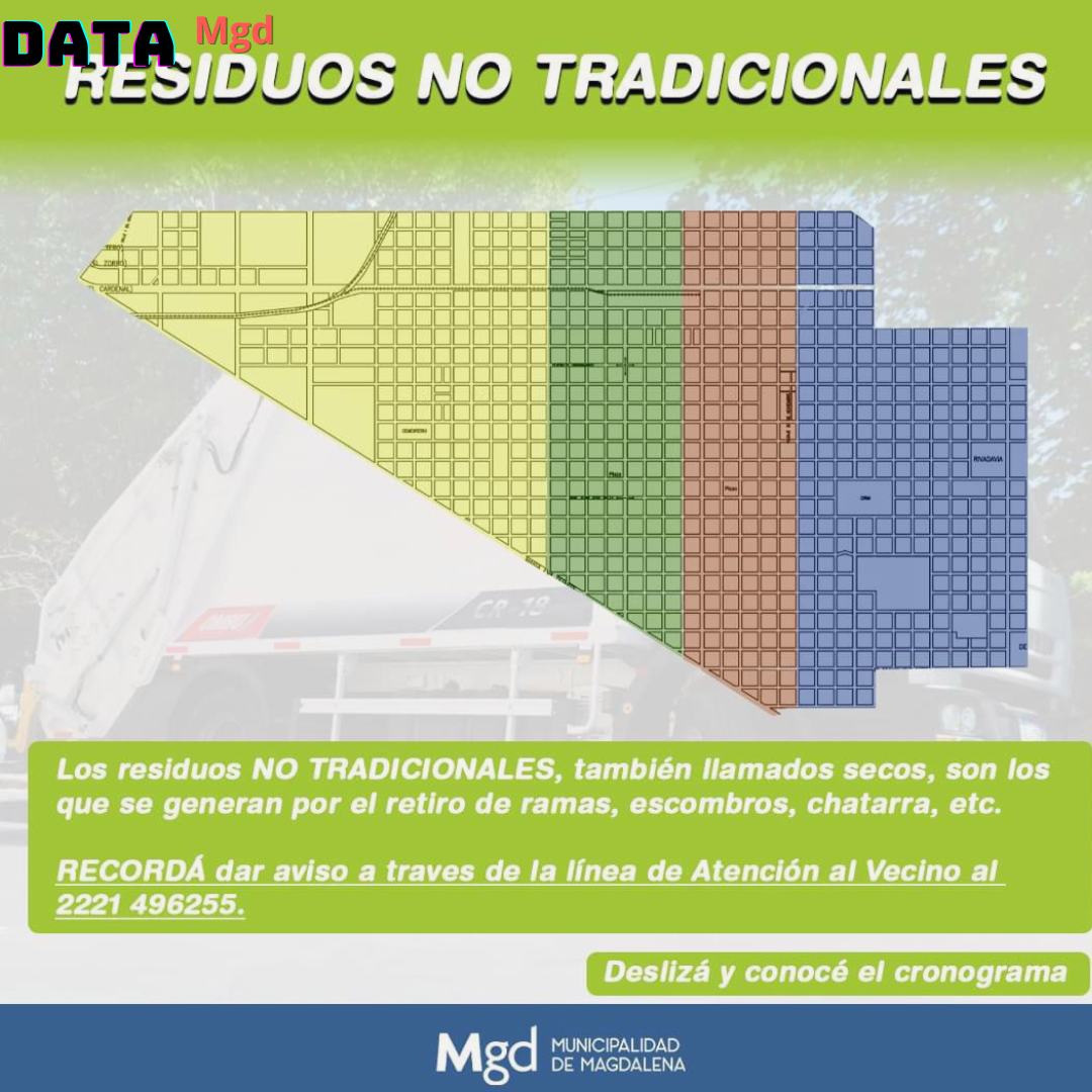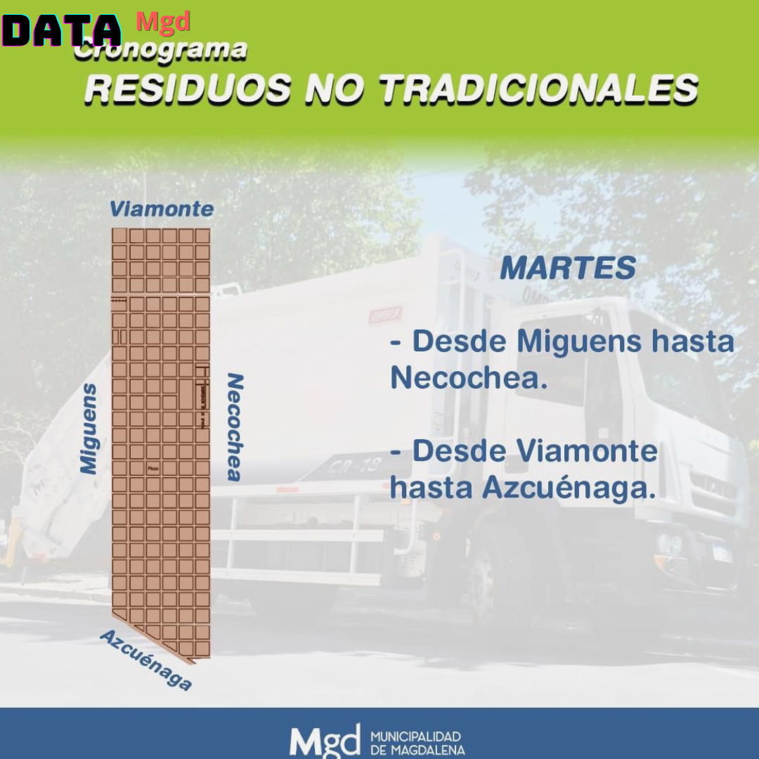 🗓️ La Dirección de Servicios Públicos de Magdalena ha emitido un recordatorio crucial para todos los vecinos de la ciudad de Magdalena: el servicio de recolección de residuos no tradicionales se realiza según un cronograma semanal. Es fundamental que los vecinos estén al tanto de los días asignados a su zona para evitar la acumulación de basura en las calles.