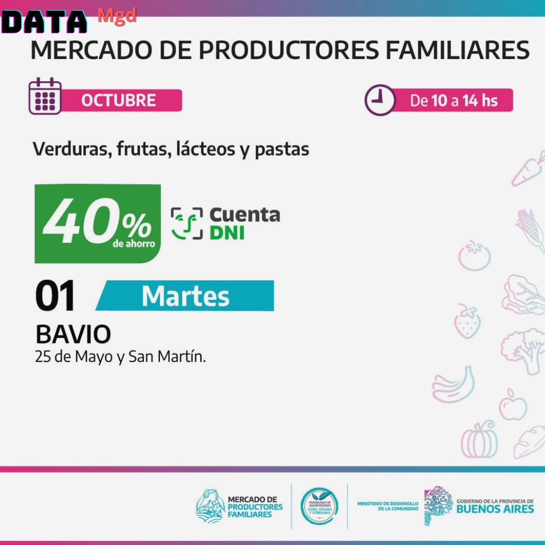 🍇 De manera simultánea, de 10 a 14 hs, el Mercado de Productores de la Provincia de Buenos Aires se ubicará en la Plaza José Hernández de Bartolomé Bavio. Este mercado itinerante, que se ha consolidado como una herramienta clave para apoyar a los pequeños productores, ofrecerá una amplia variedad de productos frescos y de calidad.