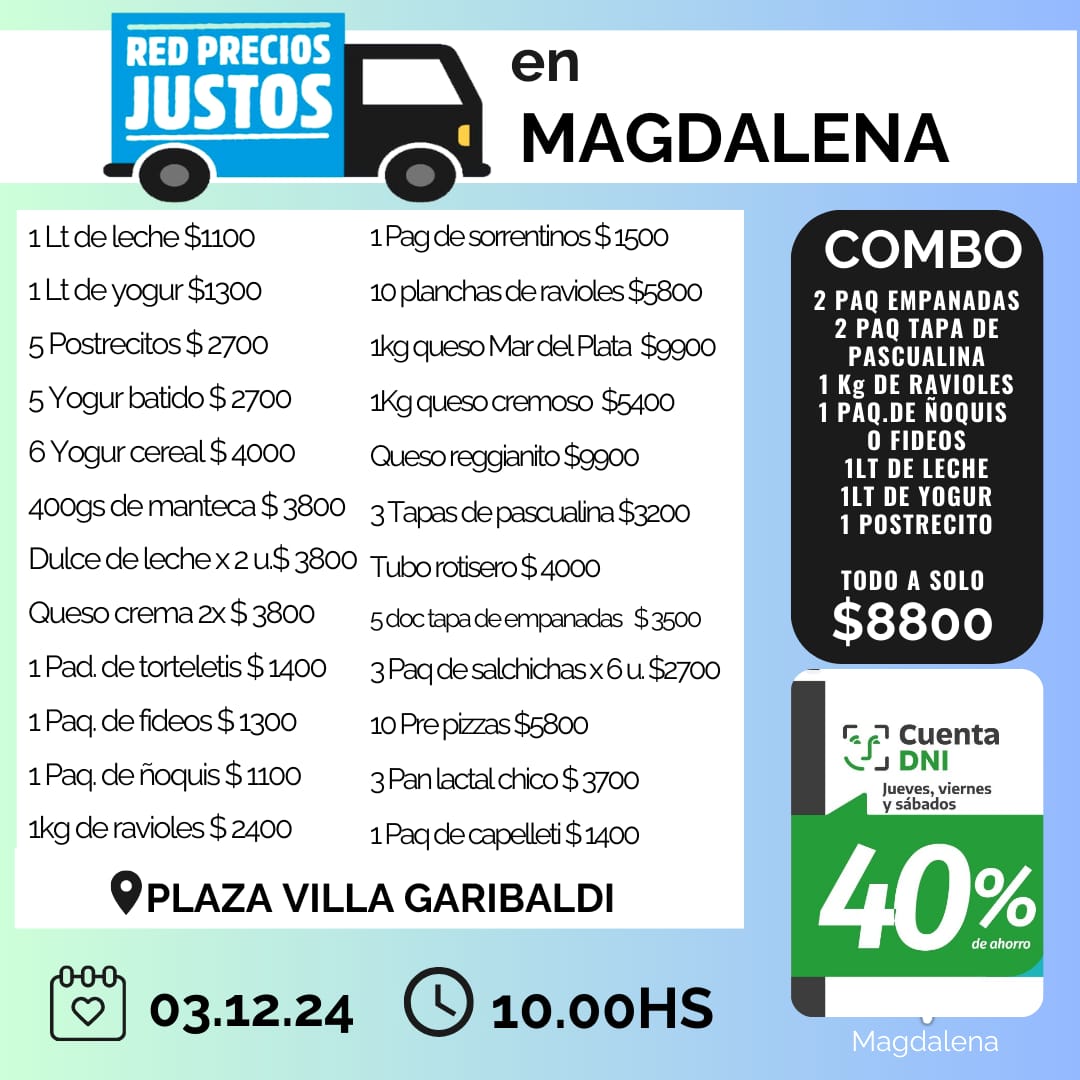 ↪️Villa Garibaldi recibirá mañana una nueva edición del programa Precios Justos, una iniciativa del Gobierno de la Provincia de Buenos Aires que busca mitigar los efectos de la inflación acercando productos básicos a valores populares. Desde las 10:00 horas, la Plaza Villa Garibaldi será el epicentro de esta jornada que promete beneficiar a cientos de vecinos con precios accesibles en frutas, verduras, lácteos, pastas y más.