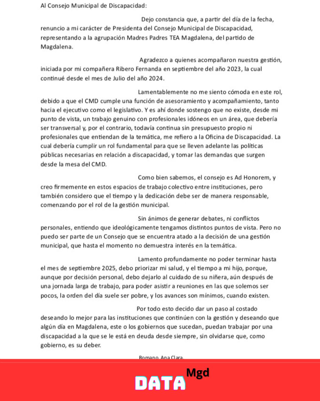 📝 En su nota de renuncia, Romano agradeció el acompañamiento recibido y explicó sus razones para dar un paso al costado: “Dejo constancia que, a partir del día de la fecha, renuncio a mi carácter de Presidenta del Consejo Municipal de Discapacidad, representando a la agrupación Madres Padres TEA Magdalena”.