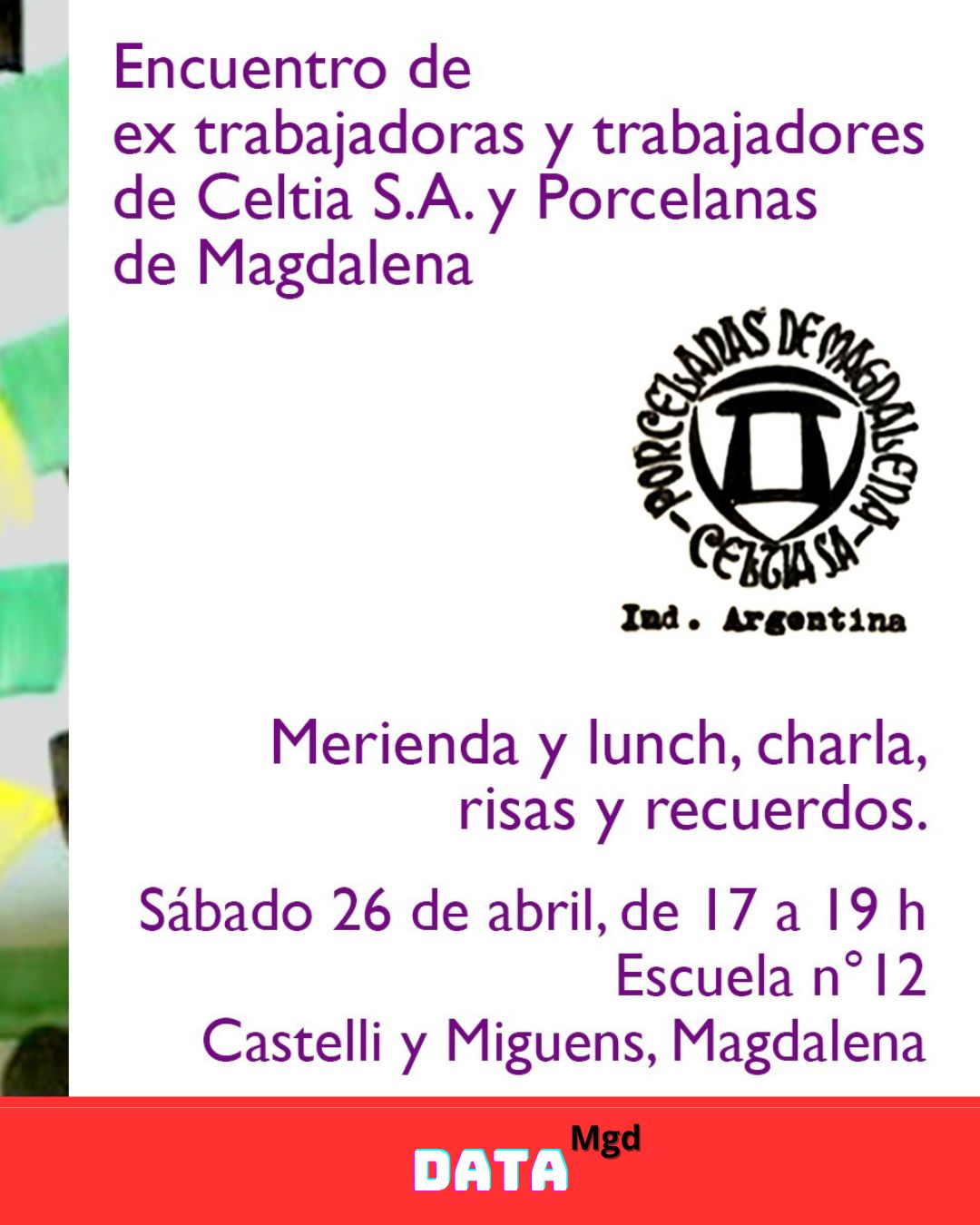 Este sábado 26 de abril tendrá lugar un encuentro cargado de emoción, historia y memoria colectiva: las ex trabajadoras y trabajadores de Celtia S.A., la icónica fábrica de porcelanas de Magdalena, se reunirán en el salón de la Escuela N°12, en Castelli y Miguens, para rememorar vivencias, reconstruir recuerdos y reconectar con un capítulo clave de la identidad local.