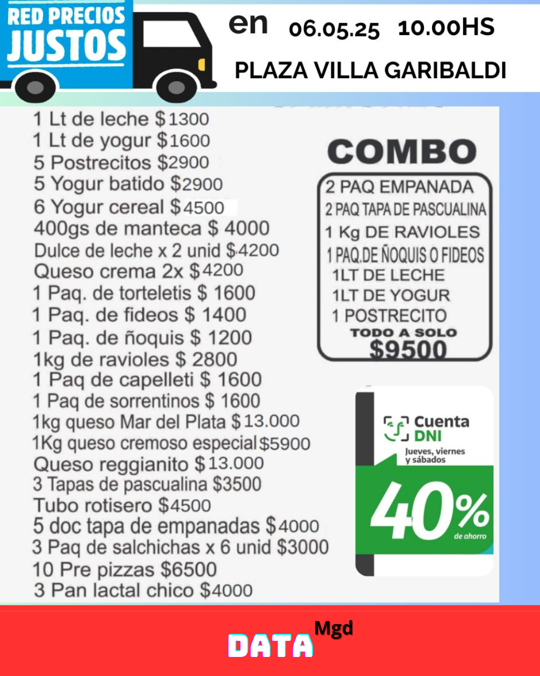 📍 Mañana martes 6 de Mayo , desde las 10:00 hs, el camión del programa “Red de Precios Justos” volverá a instalarse en la Plaza de Villa Garibaldi, acercando productos esenciales a precios populares para los vecinos de Magdalena.
