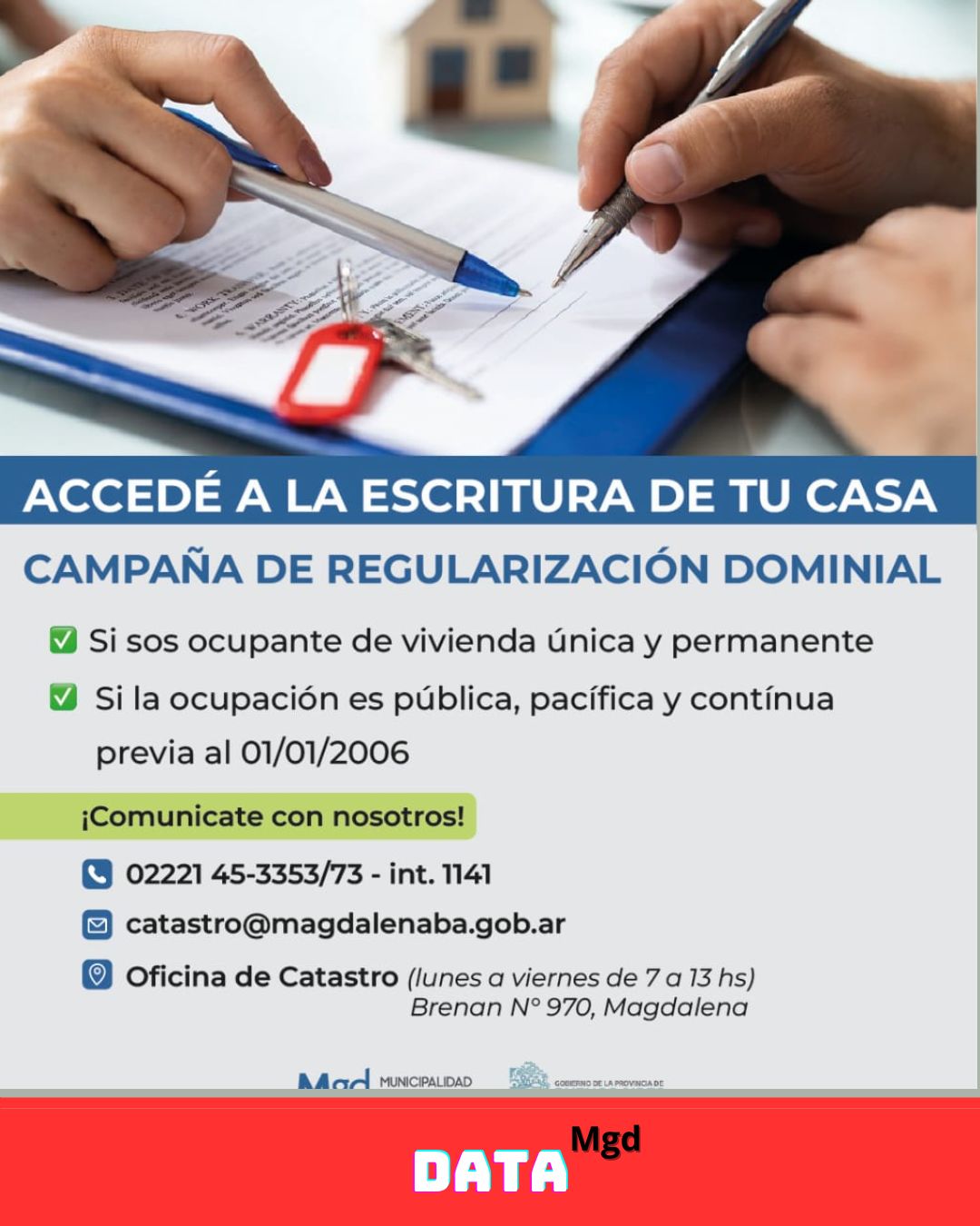 📝 ¿Vivís en tu casa desde antes de 2006? Podés acceder a la escritura definitiva de tu vivienda sin costo, gracias al nuevo Plan de Regularización Dominial que impulsa la Municipalidad de Magdalena bajo el amparo de la Ley 24.374 (Ley Pierri). Esta iniciativa apunta a brindar seguridad jurídica a quienes aún no tienen el título de propiedad de su hogar.