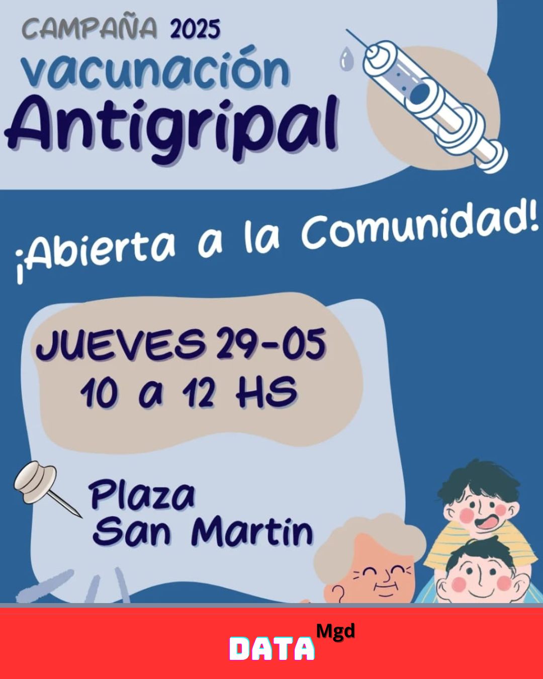 📍 Este jueves 29 de mayo, a partir de las 10:00 hs, se llevará a cabo una nueva jornada de vacunación en Plaza San Martín, abierta a todos los vecinos. La actividad se enmarca en una estrategia de acercamiento territorial, con el objetivo de garantizar el acceso a la vacuna en todo el distrito, incluyendo los parajes y escuelas rurales.