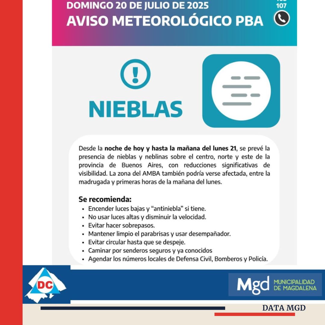 🌫️ Magdalena desde la noche de hoy y en la madrugada del lunes se presentarán bancos de niebla que reducirán drásticamente la visibilidad, especialmente durante la madrugada y las primeras horas del lunes. Se trata de un fenómeno que afectará no solo al casco urbano sino también a los caminos rurales del distrito y las rutas, donde la humedad y el frío favorecen su formación.