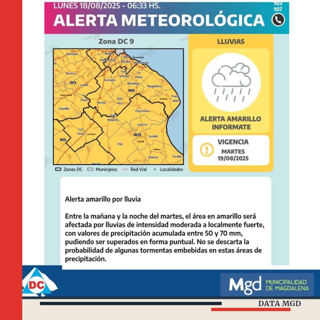 ?? El Servicio Meteorológico Nacional (SMN) lanzó un alerta amarillo para Magdalena y la región ante la llegada de un sistema de tormentas que podría dejar lluvias intensas y acumulados importantes de agua. La medida rige para el martes 19, día en el que se espera el mayor impacto del fenómeno.