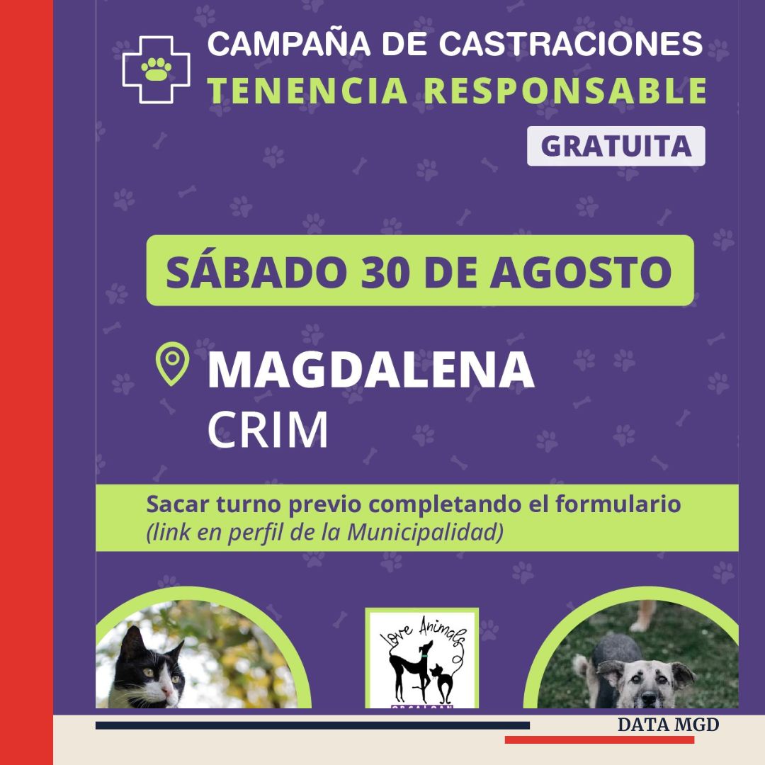 🐾 Este sábado 30 de agosto se realizará la 8va Jornada de Castraciones Masivas en Magdalena, una iniciativa conjunta entre el municipio y la organización Love Animals. La actividad tendrá lugar en el CRIM Magdalena y busca seguir avanzando en el cuidado responsable de las mascotas del distrito.