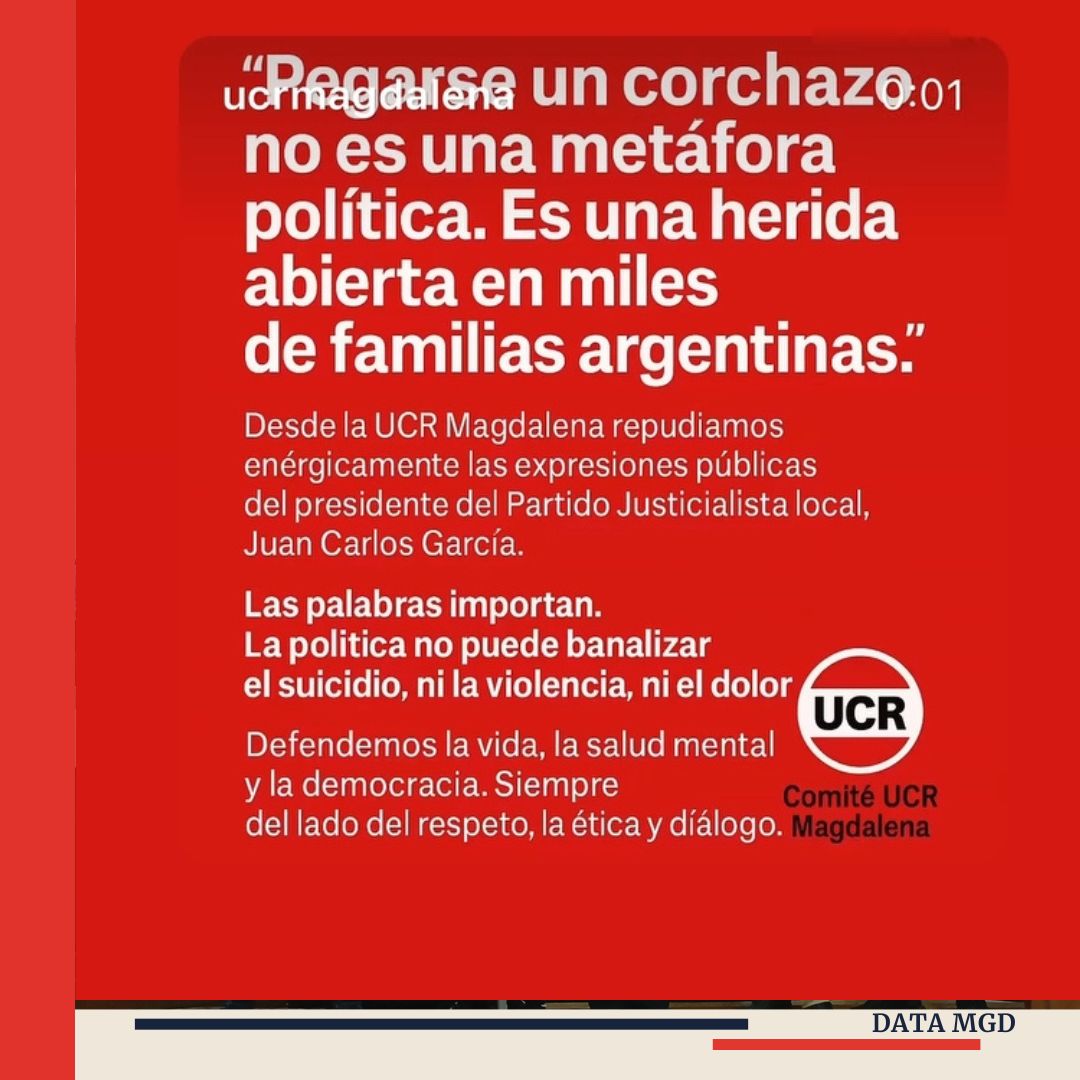 🗣️ “Desde la UCR Magdalena repudiamos enérgicamente las expresiones públicas del presidente del Partido Justicialista local, Juan Carlos García. Las palabras importan”, comienza el texto difundido por el comité radical, que rápidamente generó repercusión en redes sociales y el ámbito político local.