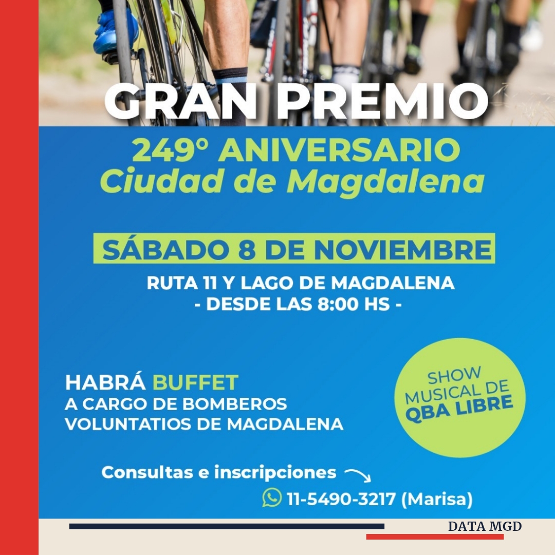 🚦 Después de 25 años, el ciclismo regresa a Magdalena con el Gran Premio 249º Aniversario Ciudad de Magdalena, que se disputará este sábado 8 de noviembre desde las 8.00. La competencia marcará el retorno de una disciplina emblemática que vuelve a tomar las calles de la ciudad en el marco de los festejos por un nuevo aniversario de su fundación.