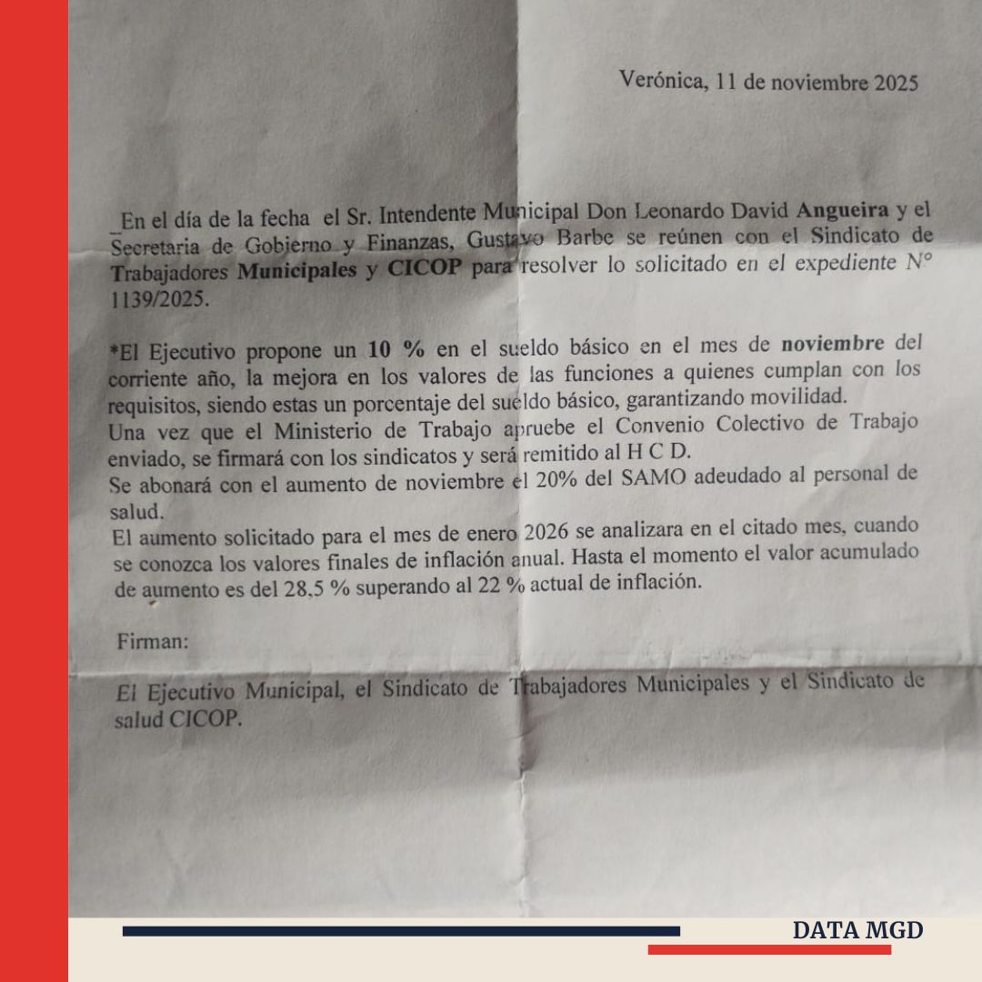Según el documento firmado, el Ejecutivo propuso un aumento del 10% en el sueldo básico para noviembre, además de una mejora en los valores de las funciones, aplicable a quienes cumplan con los requisitos establecidos, garantizando movilidad sobre el salario básico. El acuerdo también contempla que, una vez aprobado el Convenio Colectivo de Trabajo por parte del Ministerio de Trabajo, el mismo será suscripto por las partes y elevado al Honorable Concejo Deliberante.