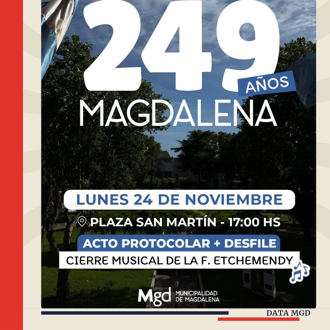 ✅La Municipalidad de Magdalena confirmó una modificación central en el cronograma del 249º aniversario: debido al mal clima que se espera para la jornada del jueves, el acto protocolar y el desfile cívico, militar y tradicionalista quedan suspendidos y reprogramados para el lunes 24 a las 17 horas, manteniendo como escenario la Plaza San Martín.