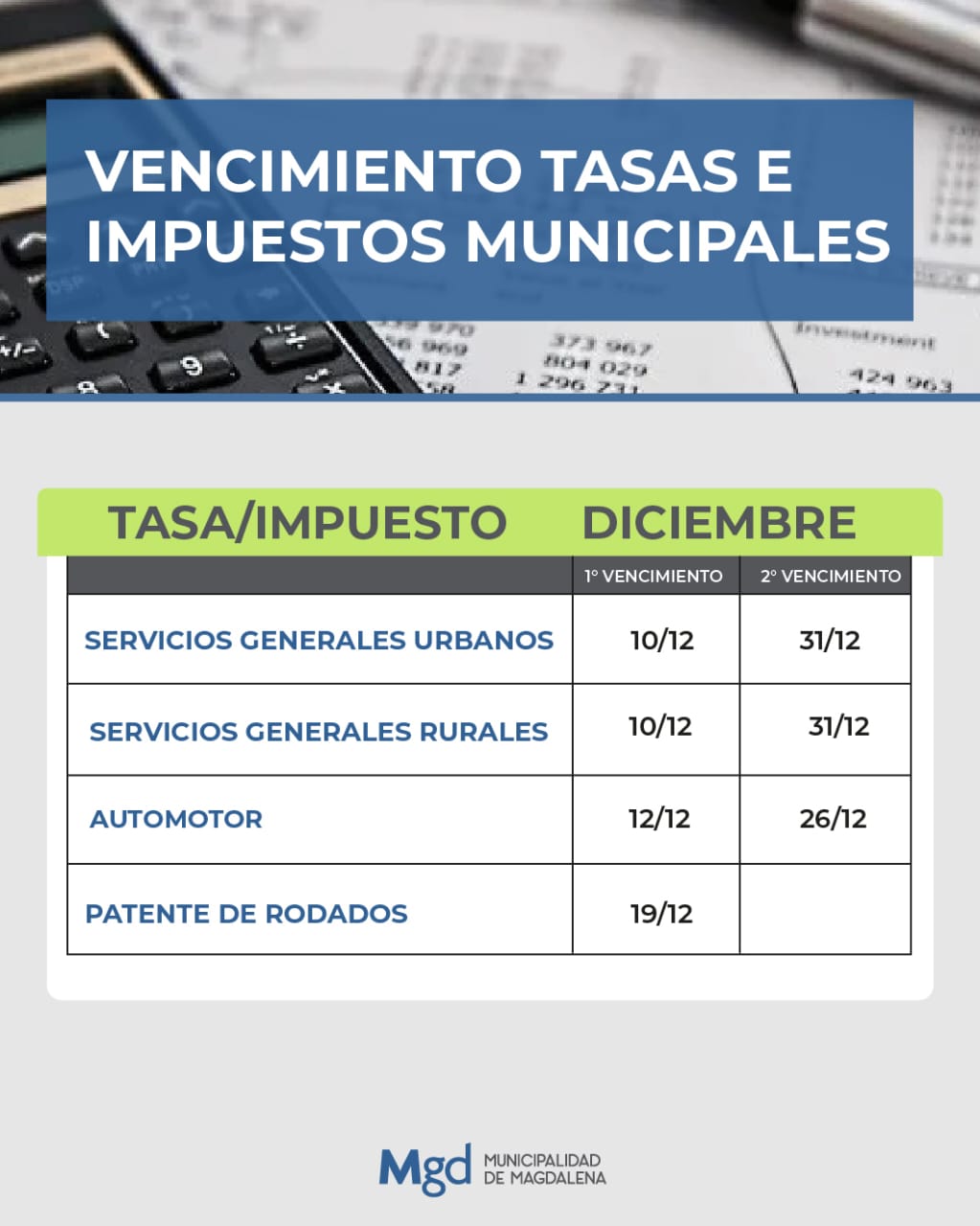 La Dirección de Ingresos Públicos informó a la comunidad el calendario oficial de vencimientos correspondiente al mes de diciembre, que incluye Servicios Generales Urbanos y Rurales, Automotor y Patentes de rodados. Desde el área destacaron la importancia de que los contribuyentes tengan presentes las fechas para facilitar una correcta planificación.