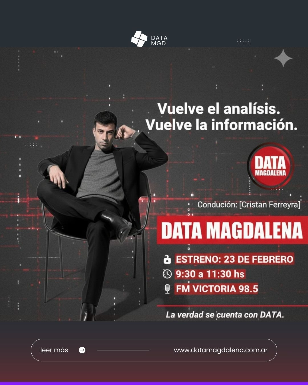 Desde DATA, este miércoles a las 9:30 horas comenzará un nuevo ciclo de DATA RADIO, que se emitirá por FM Victoria 98.5, con la conducción de Cristian Ferreyra. La propuesta marca el inicio de una nueva etapa del espacio radial, con eje en la información local, provincial y nacional.