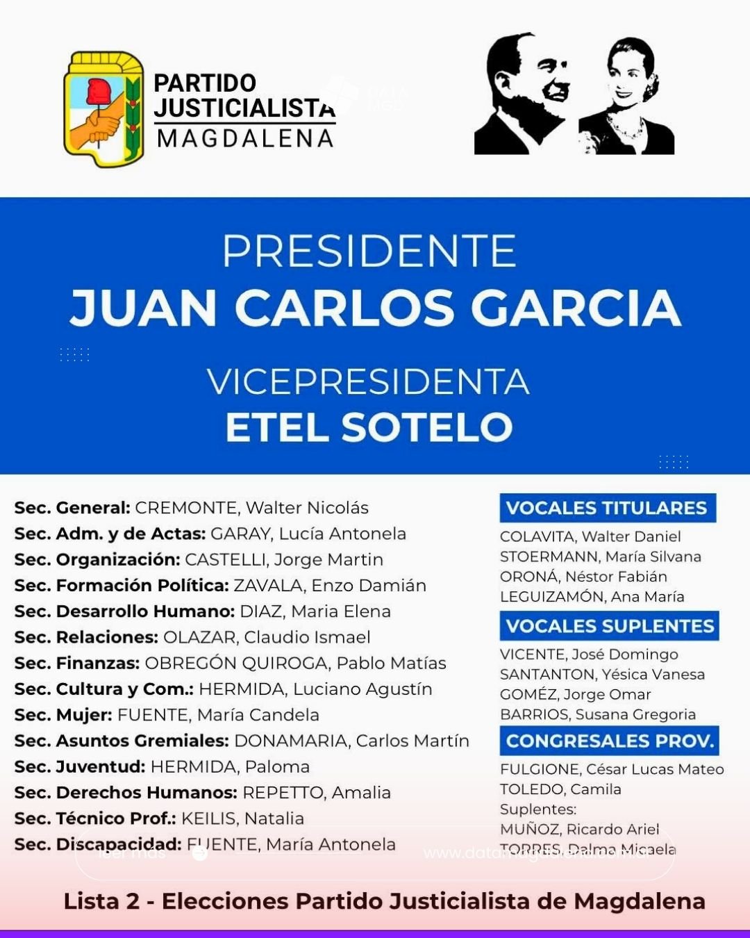 La Lista 2 – Oficialista es encabezada por el actual presidente del PJ local, Juan Carlos García, quien busca renovar su mandato alineado con la conducción provincial. El espacio reúne sectores del Movimiento Derecho al Futuro (MDF), el sector de César Fulgione referenciado en Cascallares, el Movimiento Evita – UTEP y el Movimiento Mayo – Suteba, entre otros.