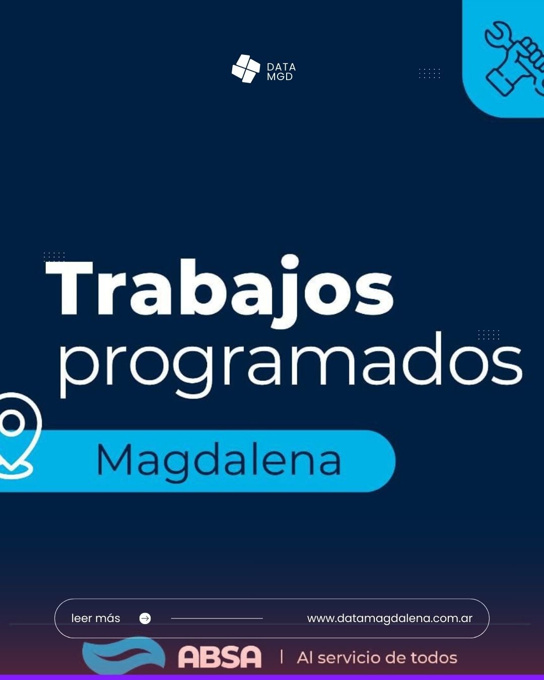 La empresa ABSA informó que este sábado 14 de marzo se realizarán trabajos de reparación sobre el acueducto ubicado en la Ruta 20, una intervención que afectará el suministro de agua en las localidades de Magdalena y Atalaya.