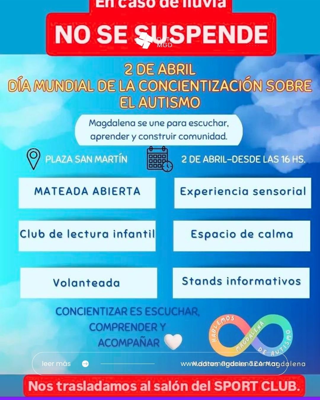 El encuentro se desarrollará en la Plaza San Martín desde las 16 horas, con una agenda de propuestas pensadas para compartir experiencias y generar mayor conciencia sobre el autismo. En caso de lluvia la jornada no se suspende se pasa al salón del Club del Sport Club Magdalena.