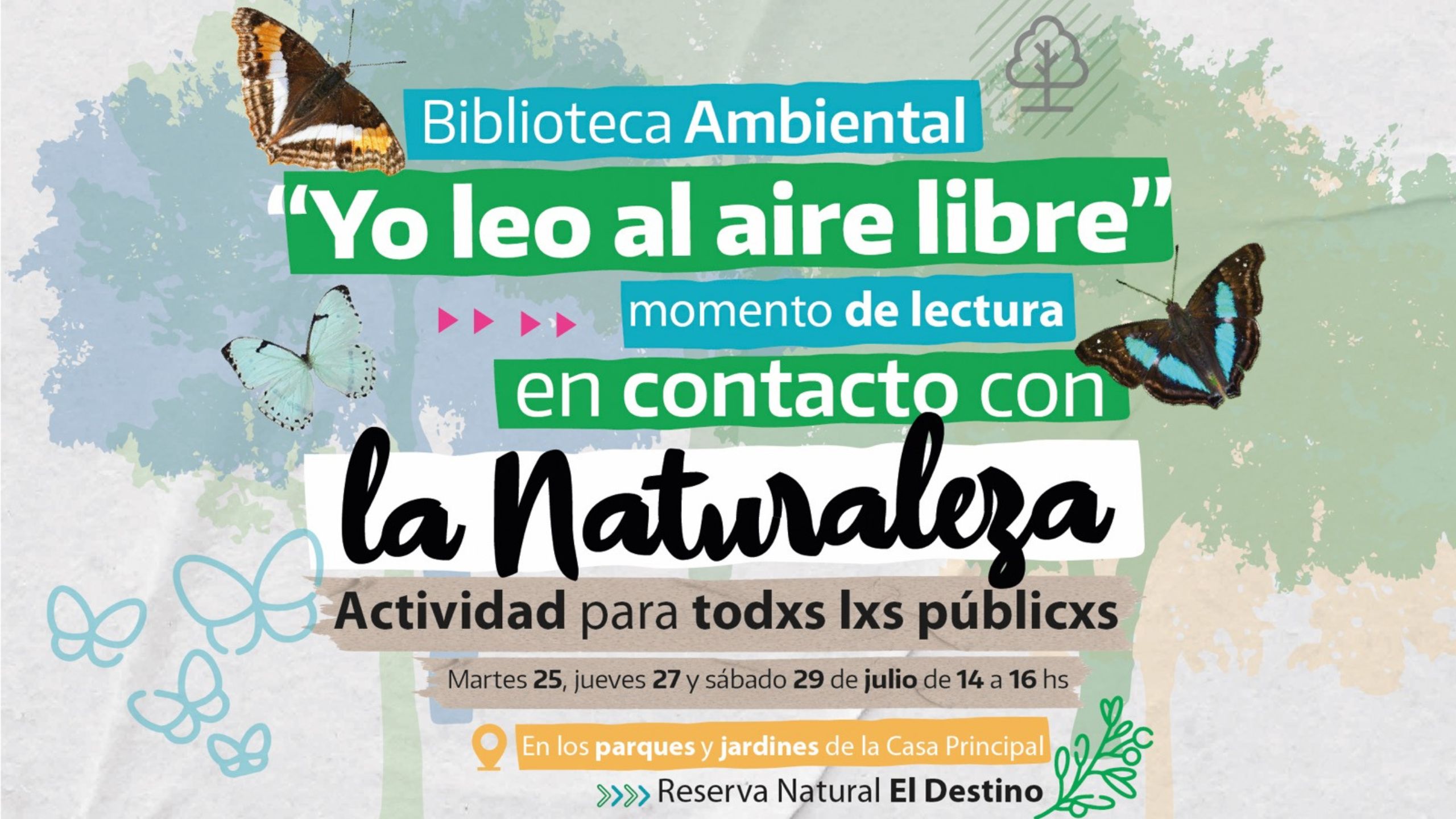 La Reserva Natural "El Destino" los espera para compartir esta maravillosa experiencia de lectura al aire libre. Recuerde, el evento se llevará a cabo los días martes 25, jueves 27 y sábado 29 de Julio, en el horario de 14:00 a 16:00 horas, en los parques y jardines de la Casa Principal de la Reserva "El Destino" Fundación Elsa Shaw de Pearson.