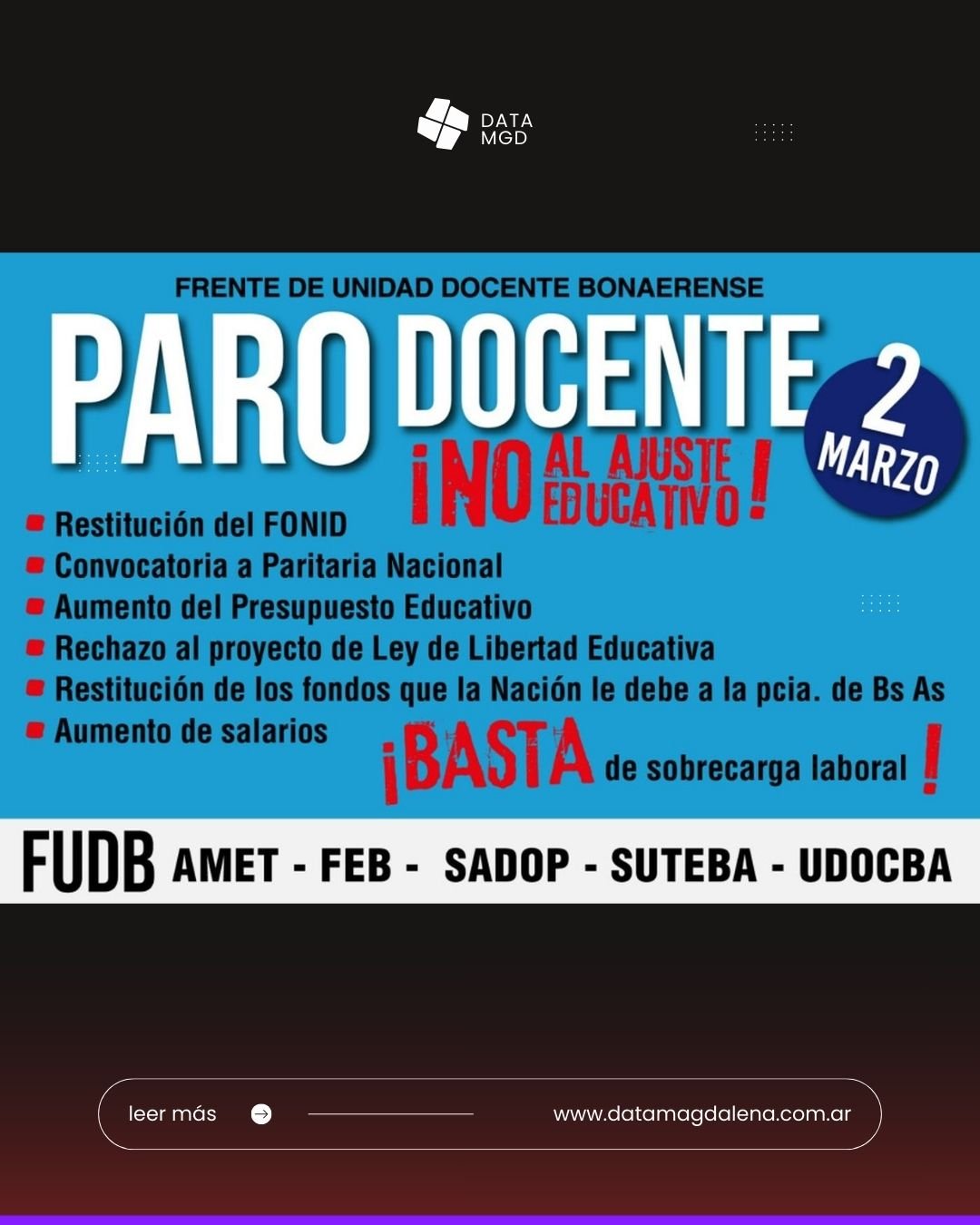 La huelga fue ratificada por las principales organizaciones del sector. Tras el anuncio de la Federación de Educadores Bonaerenses (FEB), el Sindicato Unificado de Trabajadores de la Educación de la provincia de Buenos Aires (SUTEBA) también promovió un paro con alcance nacional. La medida cuenta además con el respaldo de la Asociación del Magisterio de Enseñanza Técnica (AMET), el Sindicato Argentino de Docentes Privados (SADOP) y la Unión de Docentes de la provincia de Buenos Aires (UDOCBA), todos integrantes del Frente de Unidad Docente Bonaerense (FUDB).