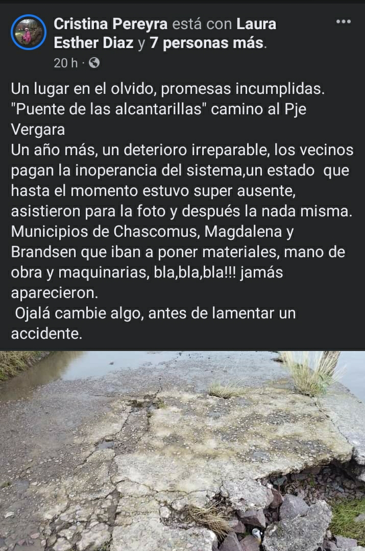 “Un lugar en el olvido, promesas incumplidas. ‘Puente de las alcantarillas’ camino al Pje Vergara. Un año más, un deterioro irreparable, los vecinos pagan la inoperancia del sistema, un estado que hasta el momento estuvo súper ausente, asistieron para la foto y después la nada misma. Municipios de Chascomús, Magdalena y Brandsen que iban a poner materiales, mano de obra y maquinarias, bla, bla, bla!!! Jamás aparecieron. Ojalá cambie algo, antes de lamentar un accidente”, escribió una vecina del lugar en sus redes sociales, expresando el sentir de toda la comunidad.